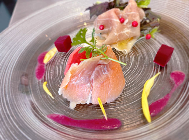 前菜は生ハムと信州サーモン。