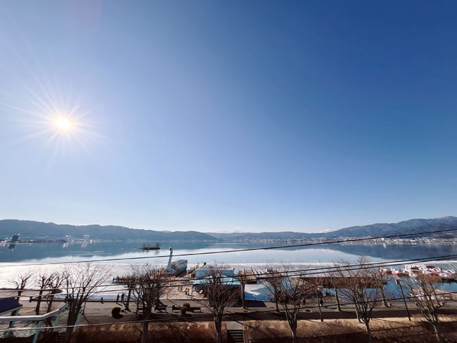 お天気が良くて、諏訪湖の湖面がひかる。
