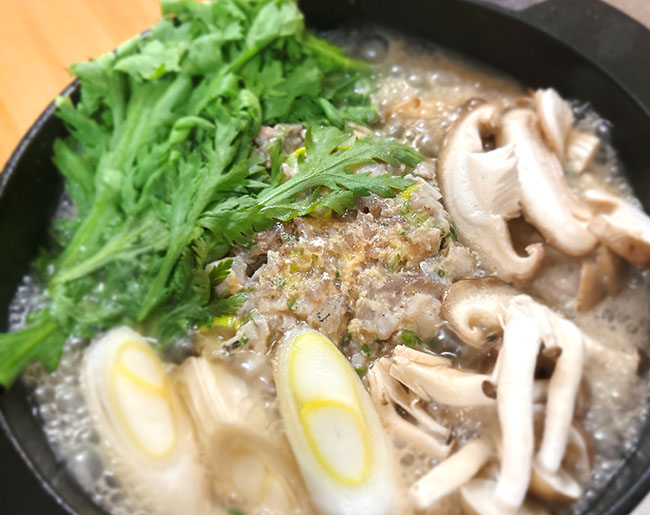 なめろうの周りにねぎ、しめじ、椎茸、ねぎをおき、なめろうを崩しながら食べる。