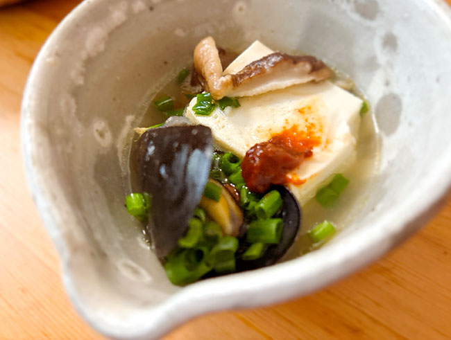 沸いてきたら、ムール貝、椎茸、豆腐を入れる。