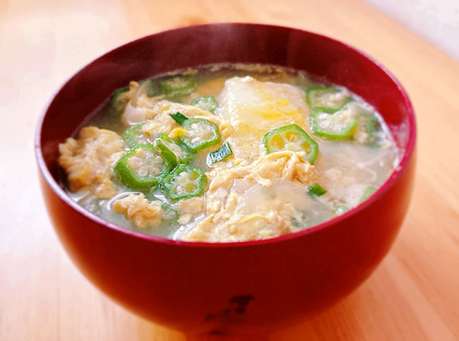 オクラも一緒に入れて煮て、仕上げに溶き卵を回し入れて、かき卵風にしてみた。