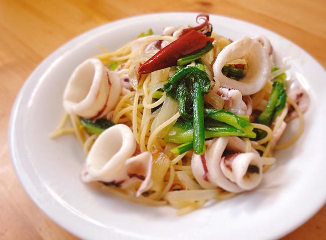 いつものアーリオ・オーリオを作り、ヤリイカと菜の花を加えて炒め、シーズニングのアンチョビキャベツで味付け。
