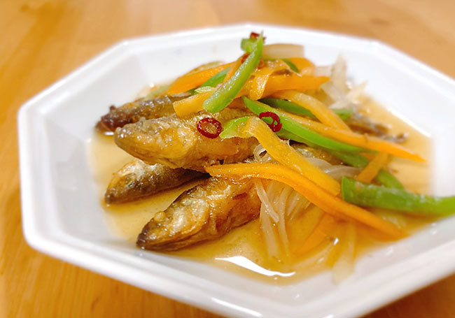 昨日唐揚げを作る時、カレー粉を混ぜる前の小麦粉をまぶしたわかさぎを揚げて、甘酢醤油に漬けておいた。