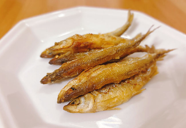 わかさぎに塩コショウ、カレー粉を混ぜた小麦粉をまぶして、ゆっくり、こんがりと揚げた。
