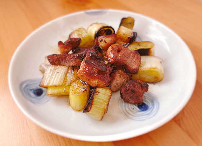 鍋に使った鴨の残りの端っこをネギと炒めた。