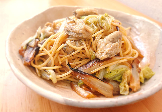 牡蠣と茹で上がったパスタを加えて、しっかりと和える。