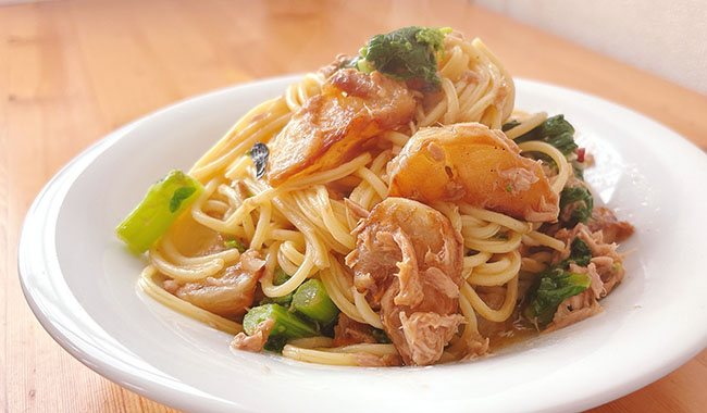 蕪を焼いていたフライパンにパスタ、菜の花、ツナを加えて、ハーブソルト味を調える。