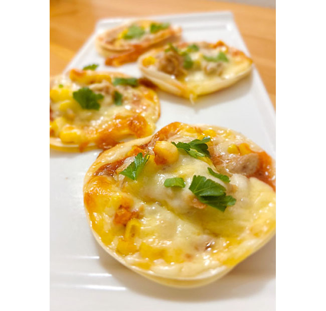 残った餃子の皮をとりあえず凍らせておいたので、それを使って簡単なミニピザ。