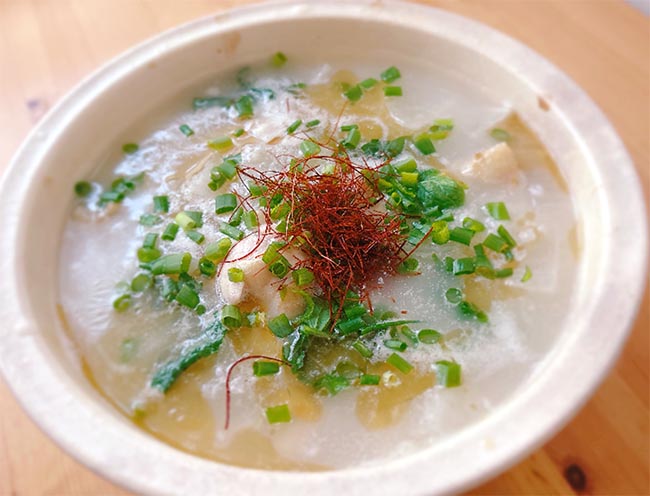 一握りの米を私や煮るのがポイントで、白濁した甘いスープになる。