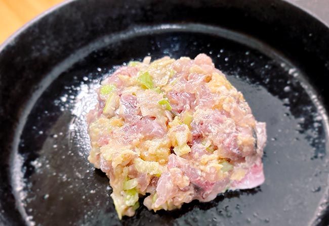 荒めに(雑に)刻み、ネギ、生姜、味噌を加えてとんとん叩く。