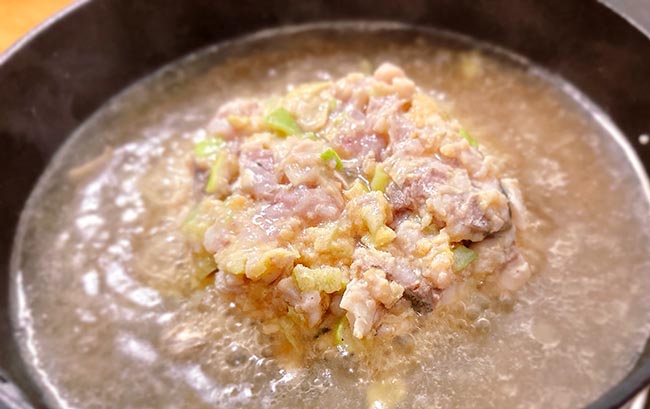 ハンバーグのようにまとめて鉄鍋に置き、火にかける。