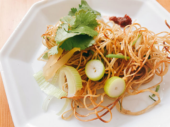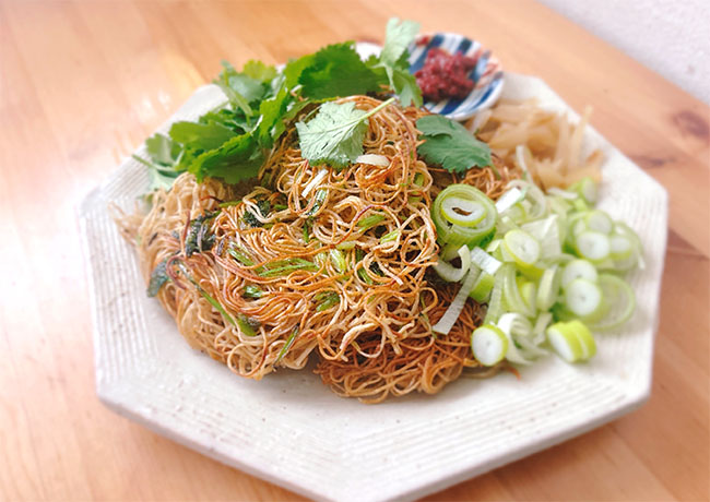 ザクザク刻んだ香菜を麺に混ぜ込み、小分けにしてカリッと焼く。